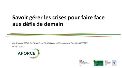 L'écosystème forestier repose sur des équilibres fragiles et le processus de crise peut se définir comme un moment critique ou une suite d'évènements perturber les équilibres en place. Les modalités de gestion et les actions à mettre en place doivent être en adéquation avec le niveau de vigilance observé et être intégrées dans de véritables stratégies d'adaptation par les gestionnaires forestiers. Découvrez dès aujourd'hui comment gérer les crises pour faire face aux défis de demain.
