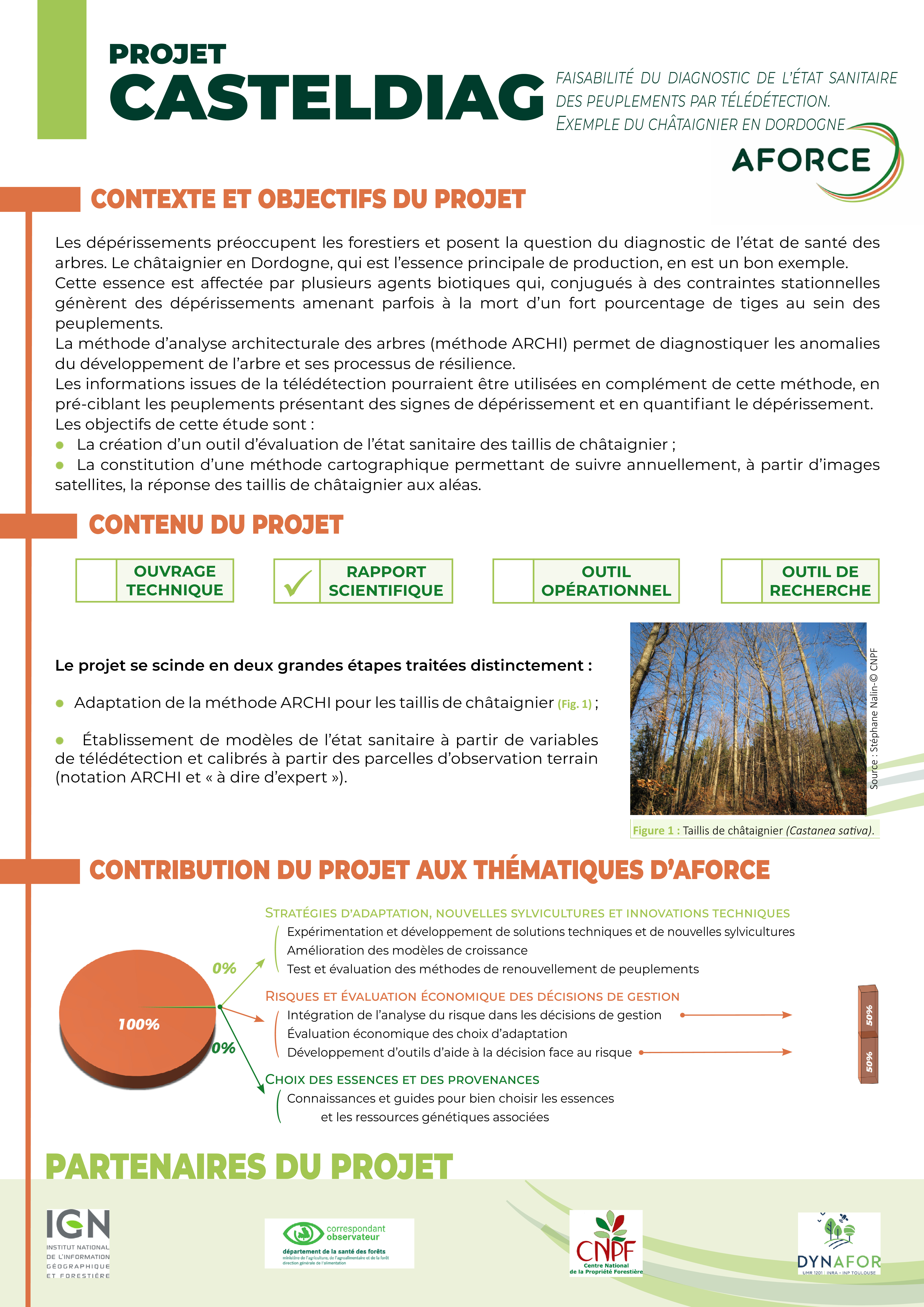 Le projet CASTELDIAG a pour objectif d’adapter la méthode ARCHI aux taillis de châtaignier, de tester les nouvelles séries d’images satellites (Sentinel-2) pour détecter l’état sanitaire de cette essence sur le département de la Dordogne et de confronter cette approche aux observations de terrain sur des placettes d’étude. Il vise à produire une méthode d'évaluation de l'état sanitaire des châtaigneraie par télédétection d'une part et à l’élaboration d’une carte du dépérissement du châtaignier sur la Dordogne d'autre part.