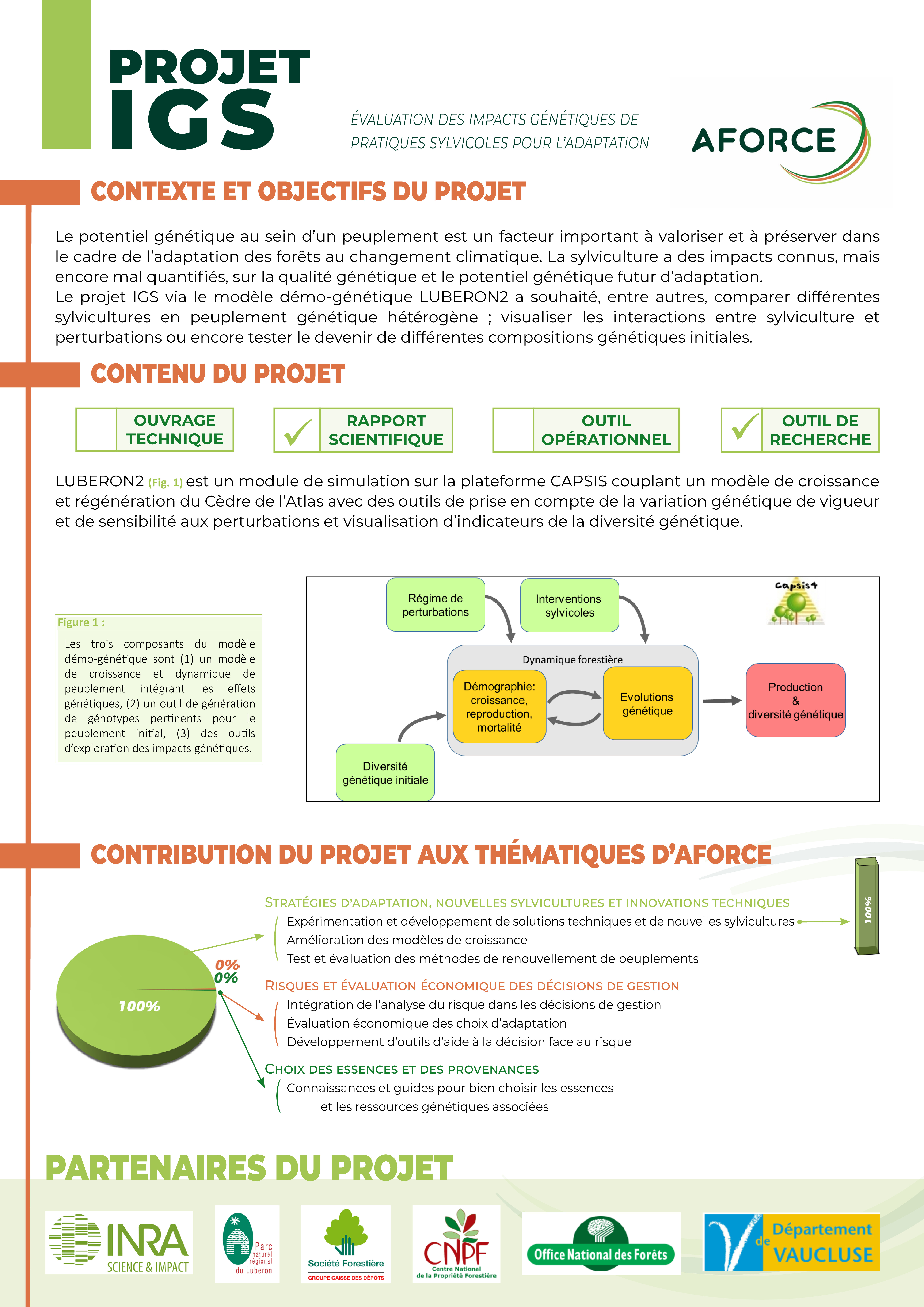 Le projet IGS a pour objectif de développer un outil de simulation permettant de comparer quantitativement différentes options sylvicoles du point de vue de leurs impacts génétiques. Le modèle, développé sur la plate-forme CAPSIS, couple des processus de dynamique de peuplement, des mécanismes génétiques et des interventions sylvicoles, sous un régime de perturbation changeant. Cet outil à destination des structures R&D contribue à guider la décision du choix entre différentes options sylvicoles ou à tester de nouveaux itinéraires sylvicoles. Étant générique, ce modèle ne prétend pas prédire précisément les impacts d’une sylviculture donnée dans une situation particulière mais plutôt comparer différentes options sylvicoles entre elles, en s’assurant de la robustesse de la comparaison dans différents contextes biologiques, sylvicoles et environnementaux.