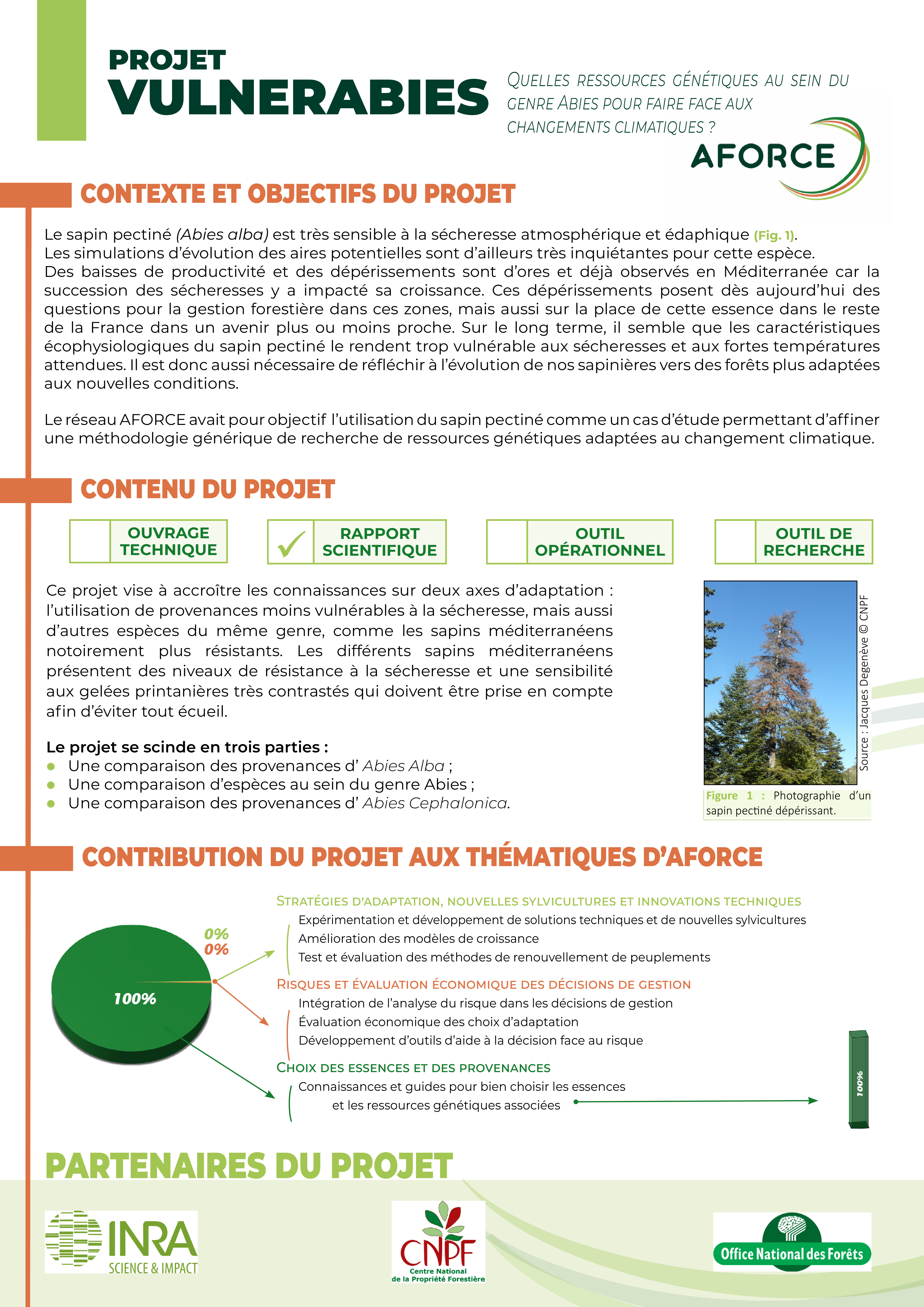 L'objectif de ce projet est de compléter nos résultats actuels qui concernent les causes biotiques et abiotiques de la mortalité par une analyse de la variabilité de vulnérabilité au sein du genre Abies (entre espèces et entre provenances au sein de Abies alba) face au stress hydrique. Pour cela, nous voulons ré-analyser et synthétiser les résultats issus des tests de provenances en France. Des mesures complémentaires (carottes, hauteur) seront effectuées pour compléter notre connaissance.