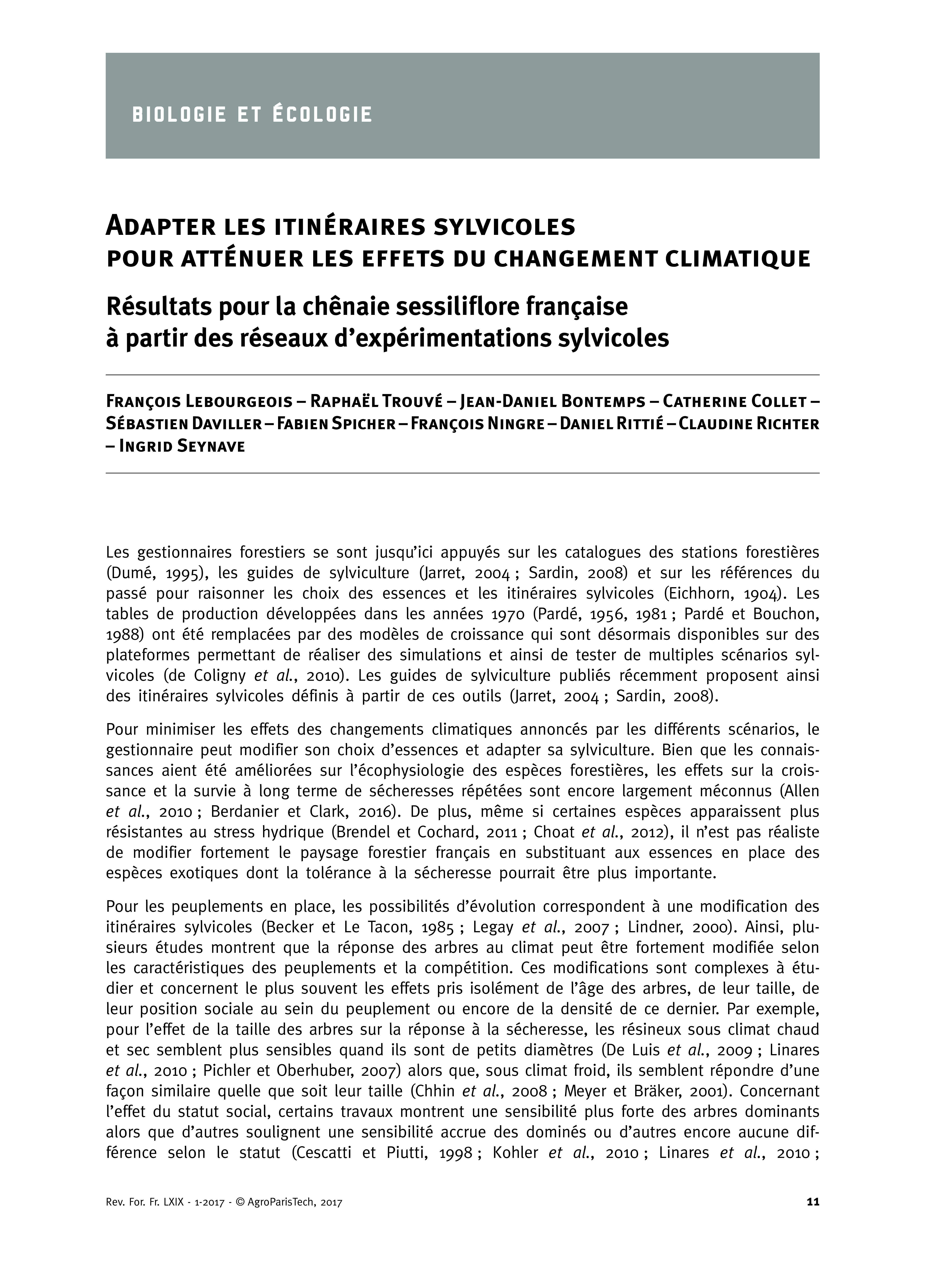 LEBOURGEOIS F., TROUVE R., BONTEMPS J-D., COLLET C., DAVILLER S., SPICHER F., NINGRE F., RITTIE D., RICHTER C., SEYNAVE I., 2017. Adapter les itinéraires sylvicoles pour atténuer les effets du changement climatique. Résultats pour la chênaie sessiliflore française à partir des réseaux d’expérimentations sylvicoles. Revue Forestière Française n°69 pp 11-32.