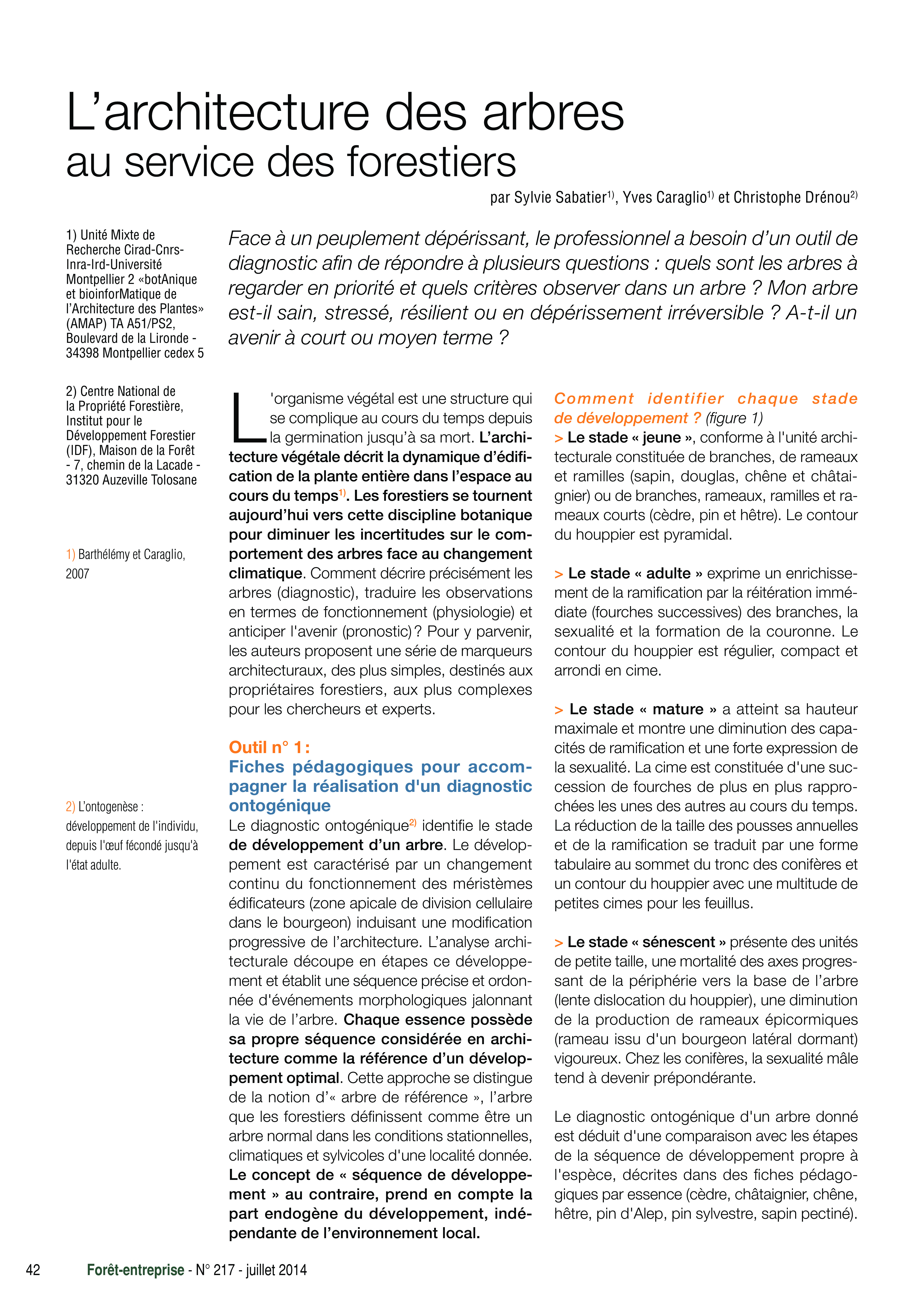 SABATIER S., CARAGLIO Y. & DRENOU Ch., 2014. L'architecture des arbres au service des forestiers in Dossier "Changement climatique : de nouveaux outils pour guider l'adaptation". Forêt-Entreprise n°217, Juillet 2014. pp 42-45.