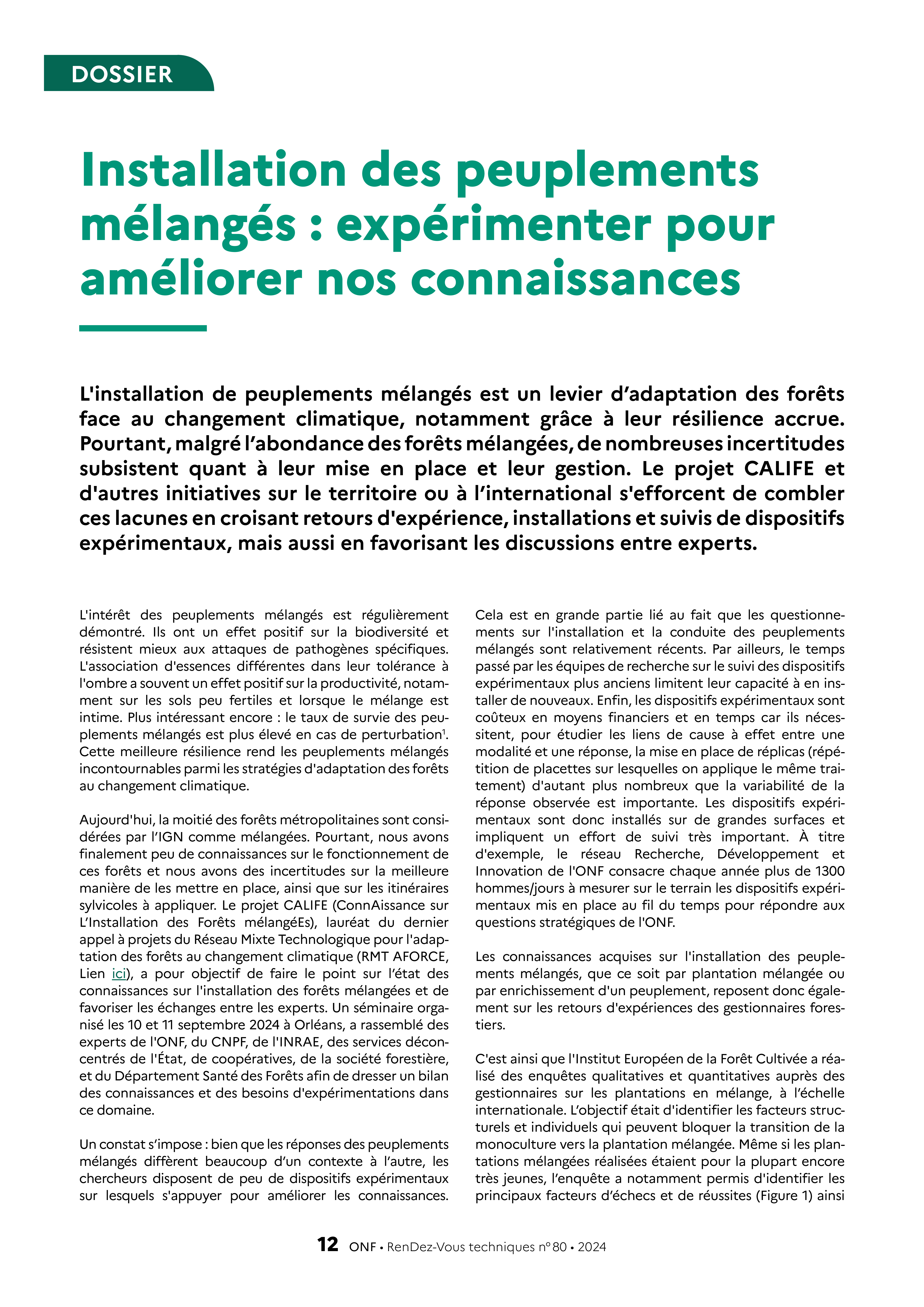 Projet CALIFE - Article, Rendez-vous Techniques de l’ONF (2024), Installation des peuplements mélangés : expérimenter pour améliorer nos connaissances