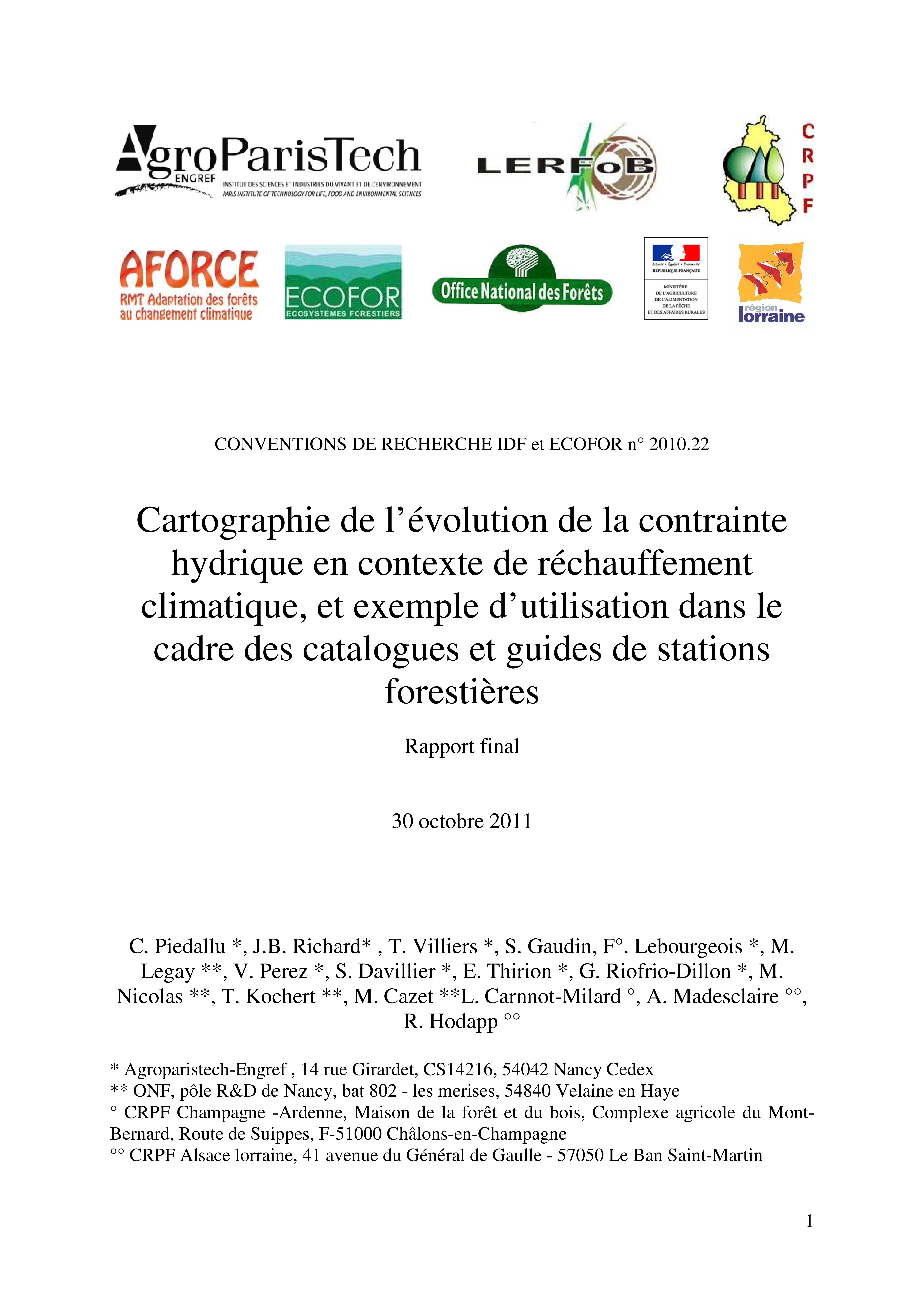 Projet CARTOBILHY - Cartographie de l’évolution de la contrainte hydrique en contexte de réchauffement climatique, et exemple d’utilisation dans le cadre des catalogues et guides de stations forestières. Rapport final