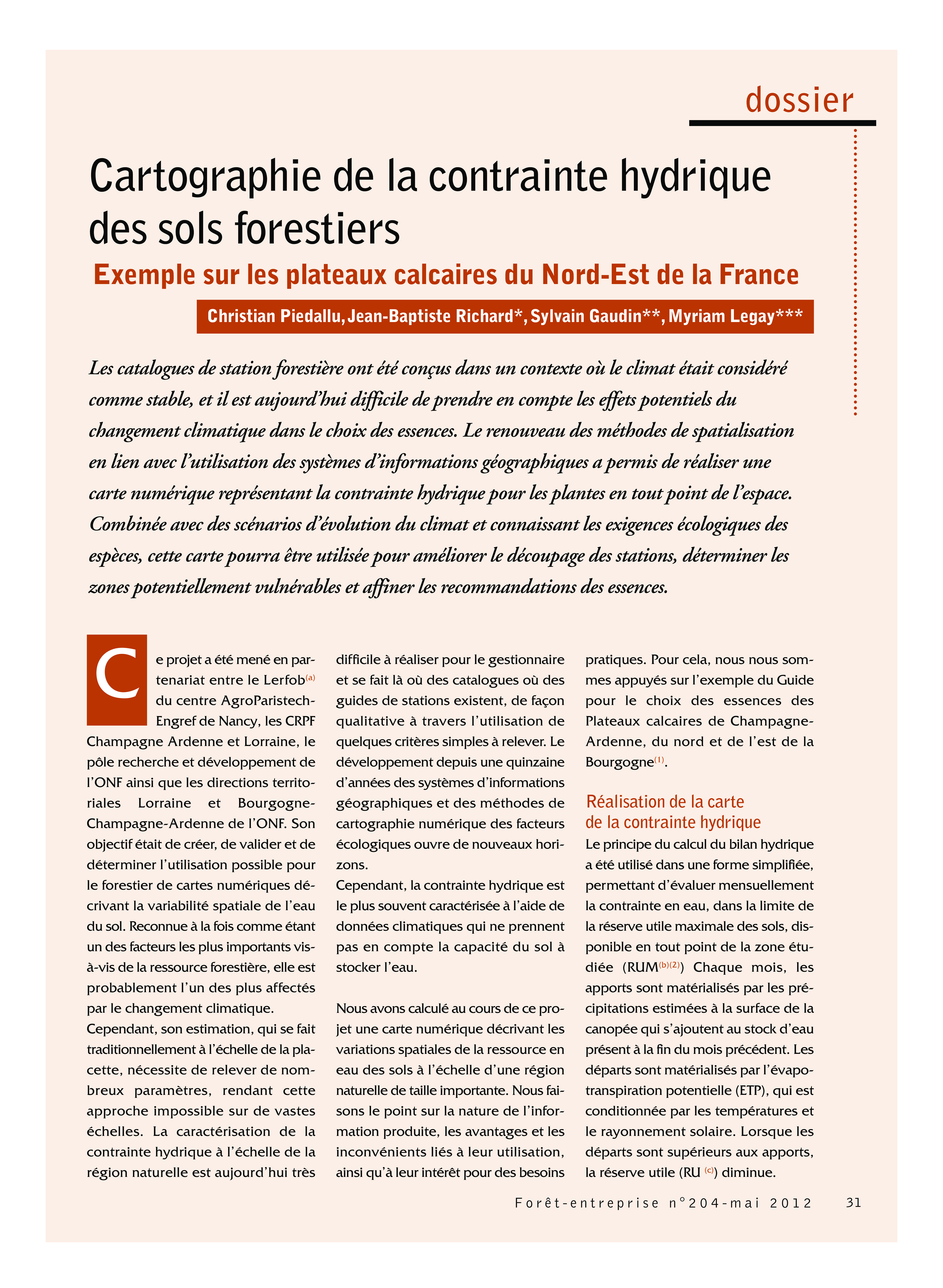 PIEDALLU C., RICHARD J-B., GAUDIN S. & LEGAY M., 2012. Cartographie de la contrainte hydrique des sols forestiers. Exemple sur les plateaux calcaires du Nord-Est de la France. In Dossier “Changement climatique : quelques outils pour comprendre et anticiper”. Forêt-Entreprise n°204. pp 31-35.