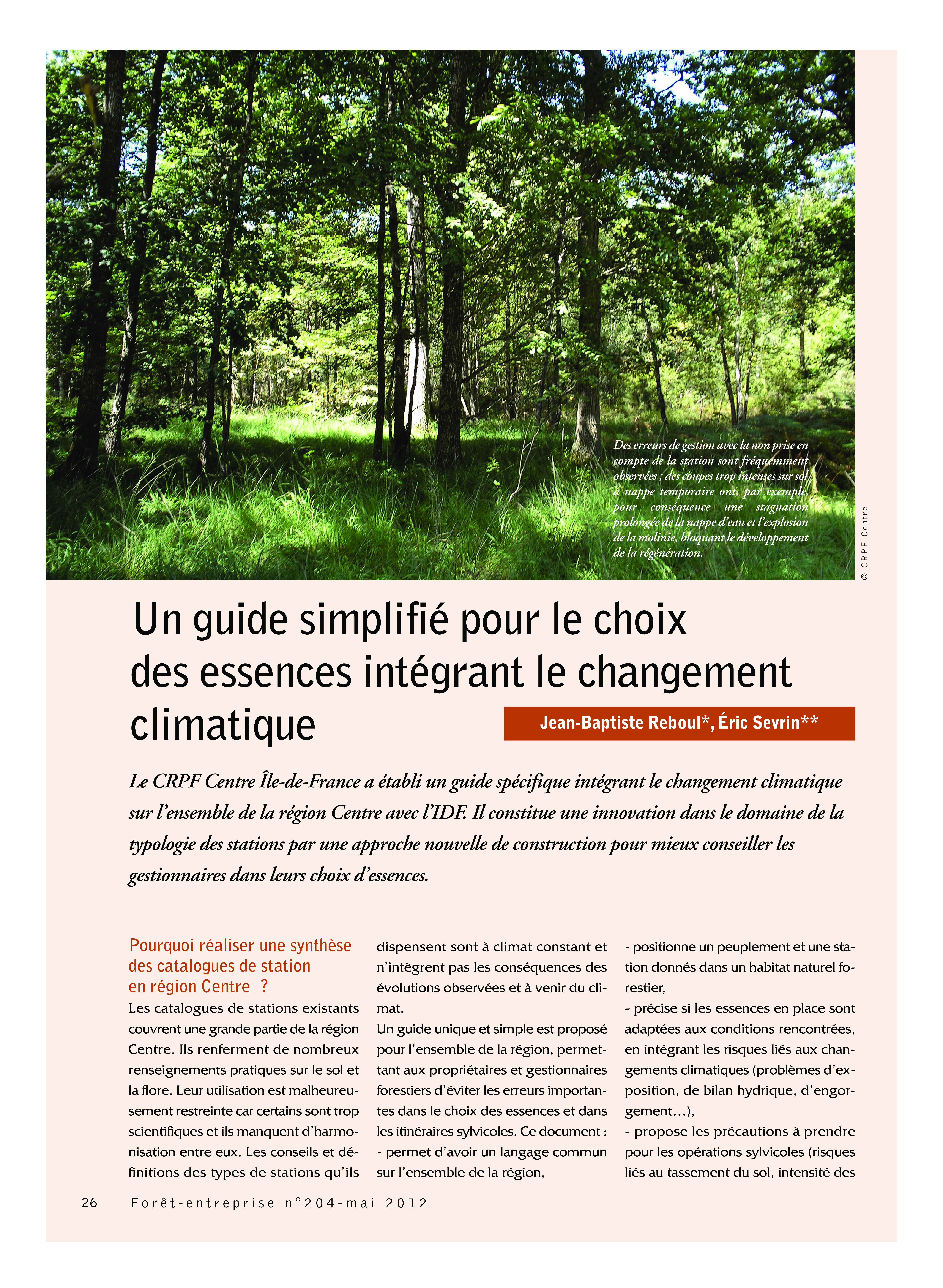 REBOUL J-B. et SEVRIN E., 2012. Un guide simplifié pour le choix des essences intégrant le changement climatique. In Dossier “Changement climatique : quelques outils pour comprendre et anticiper”. Forêt-Entreprise n°204 . pp 26-30.