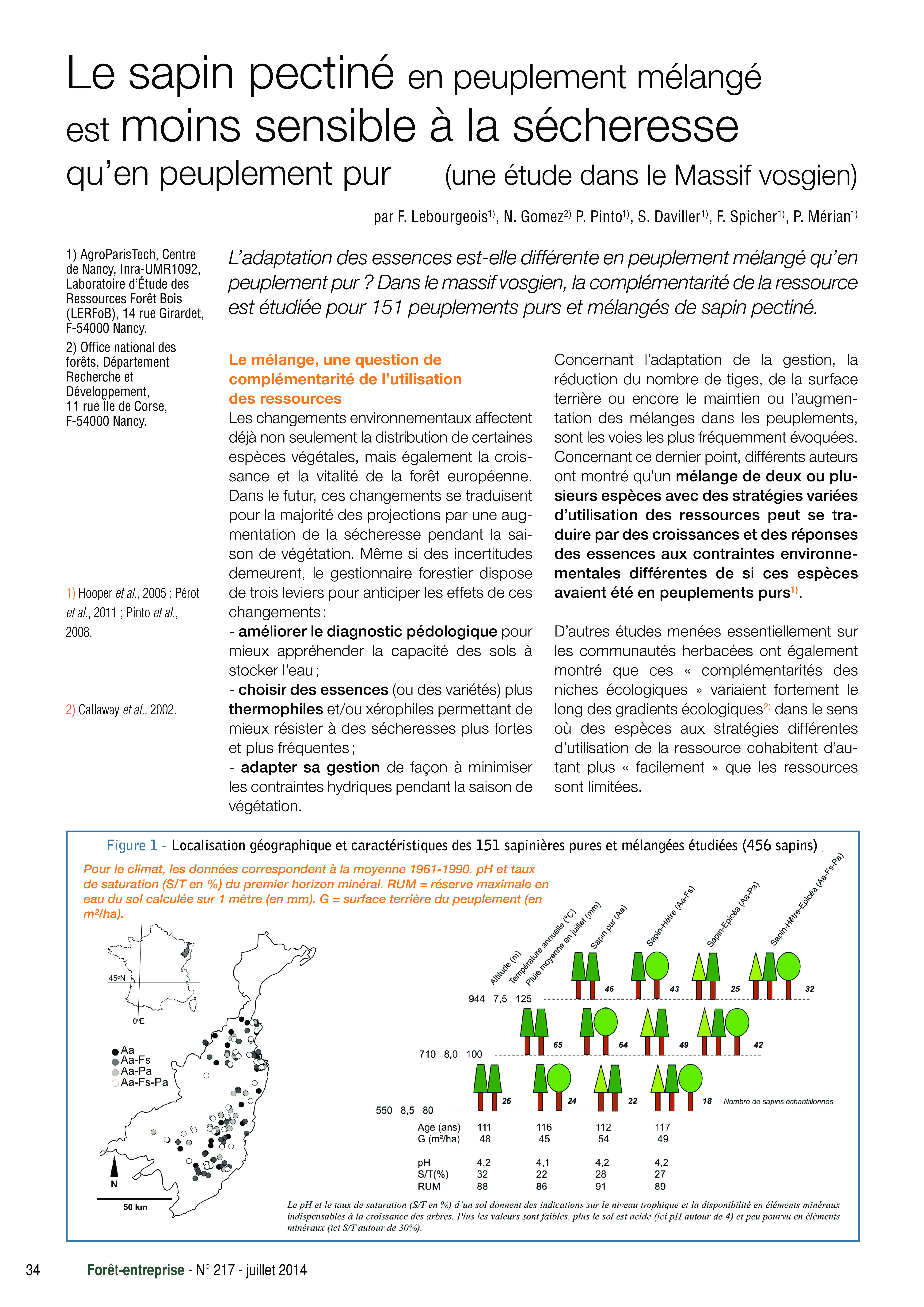 LEBOURGEOIS F., GOMEZ N., PINTO P., DAVILLER S., SPICHER F. & MERIAN P., 2014. Le sapin pectiné en peuplement mélangé est moins sensible à la sécheresse qu’en peuplement pur (une étude dans le Massif vosgien). Forêt-entreprise n° 217 in Dossier "Changement climatique : de nouveaux outils pour guider l'adaptation". pp 34-37.