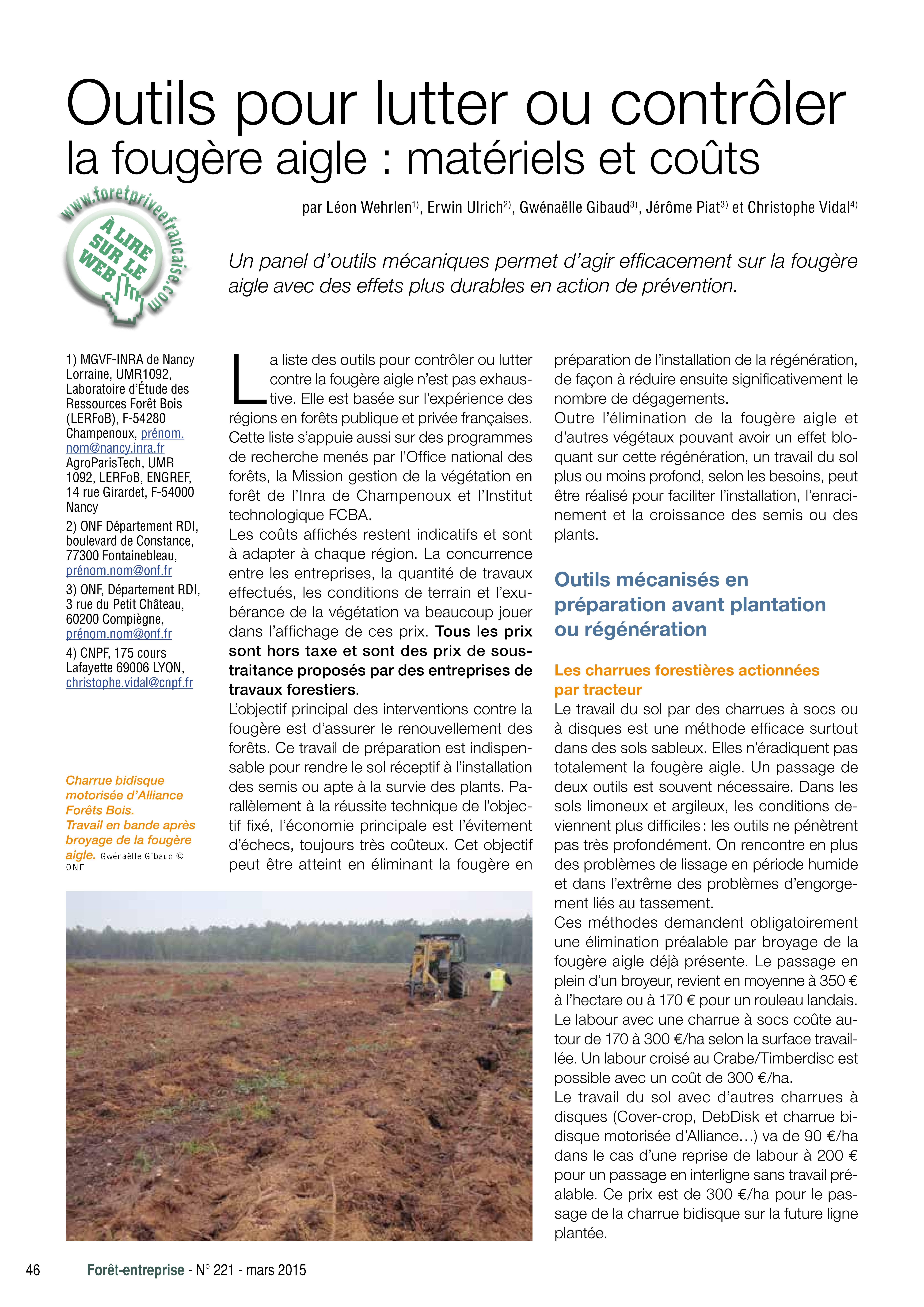 WEHRLEN L. et al., 2015. Outils pour lutter ou contrôler la fougère aigle : matériels et coûts. Forêt Entreprise n°217 in Dossier “Fronde contre la fougère aigle”. Pages 46-50.
