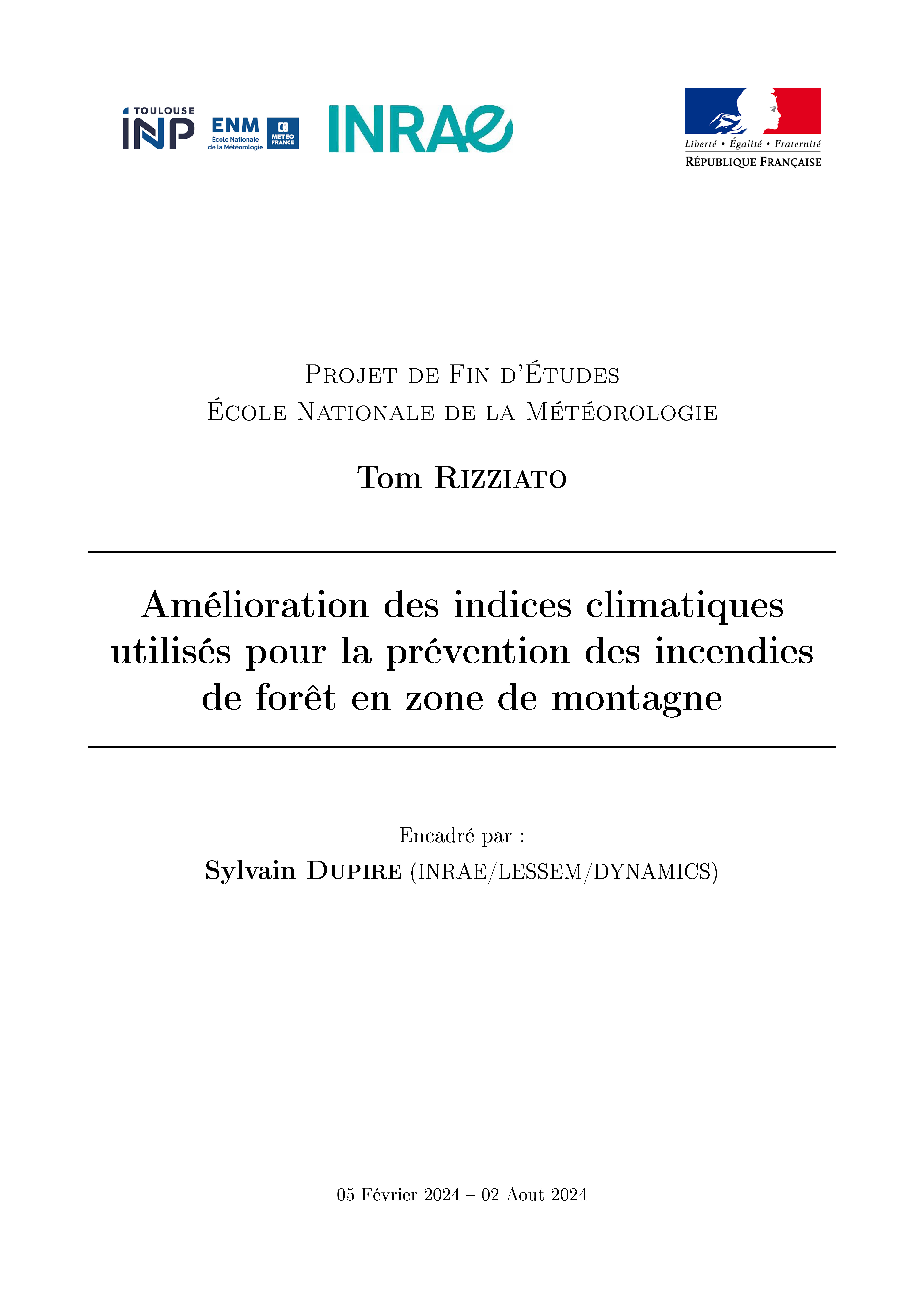 RIZZIATO T., 2024. Amélioration des indices climatiques utilisés pour la prévention des incendies de forêt en zone de montagne. Rapport de fin d'études. Ecole Nationale de la Météorologie, Toulouse, France, 38 pages. Encadrement : Sylvain Dupire, (INRAE/LESSEM/DYNAMICS).