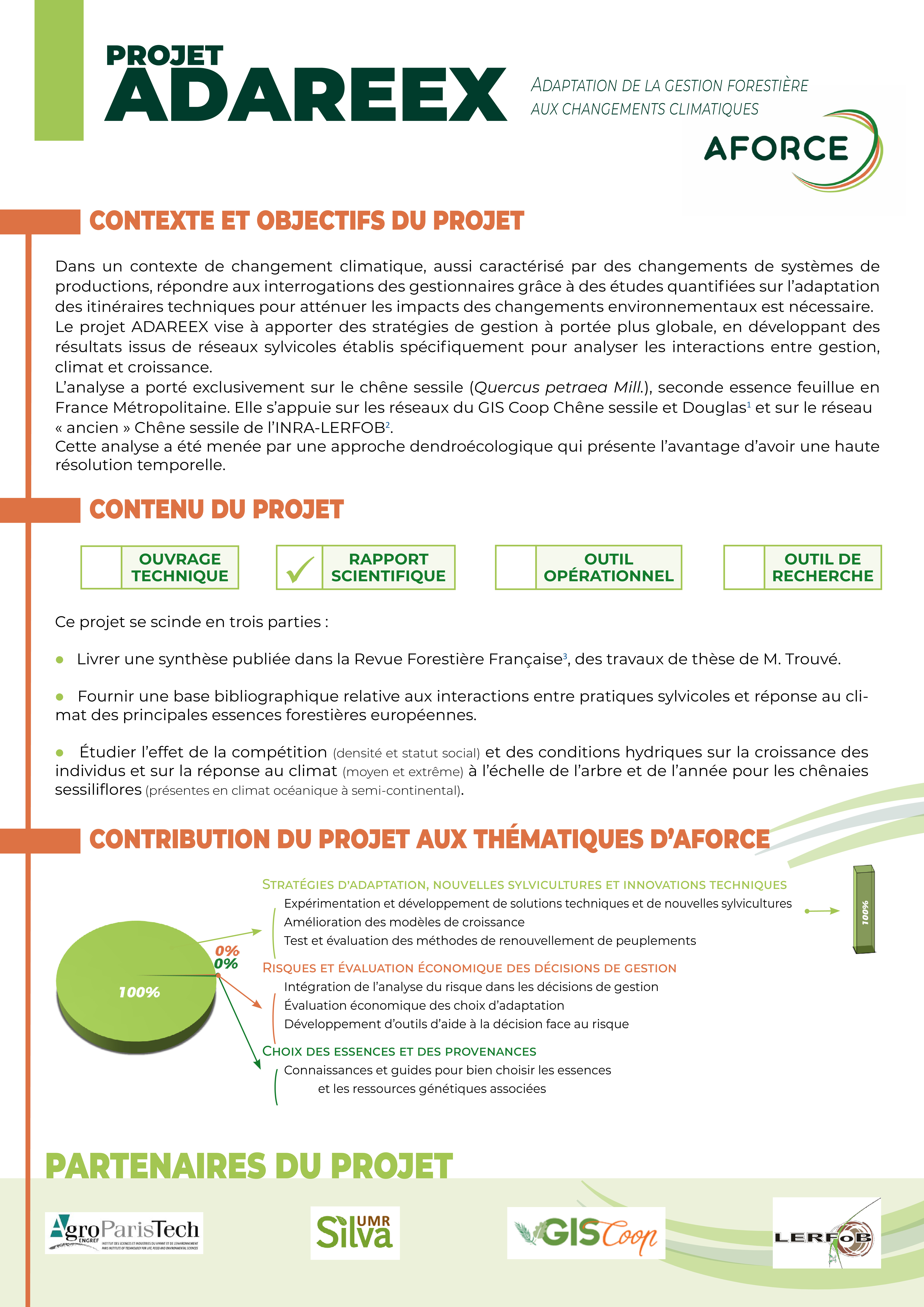 Le projet ADAREEX a pour objectifs de mettre en évidence, à partir d'une synthèse bibliographique, les pratiques novatrices optimisant la résistance et la résilience des principales essences forestières européennes aux aléas environnementaux ainsi que d’étudier spécifiquement l’effet de la compétition (selon la densité du peuplement et le statut social de l’arbre) sur la réponse au climat de chênaies sessiliflores couvrant l’aire naturelle de l’espèce en France.