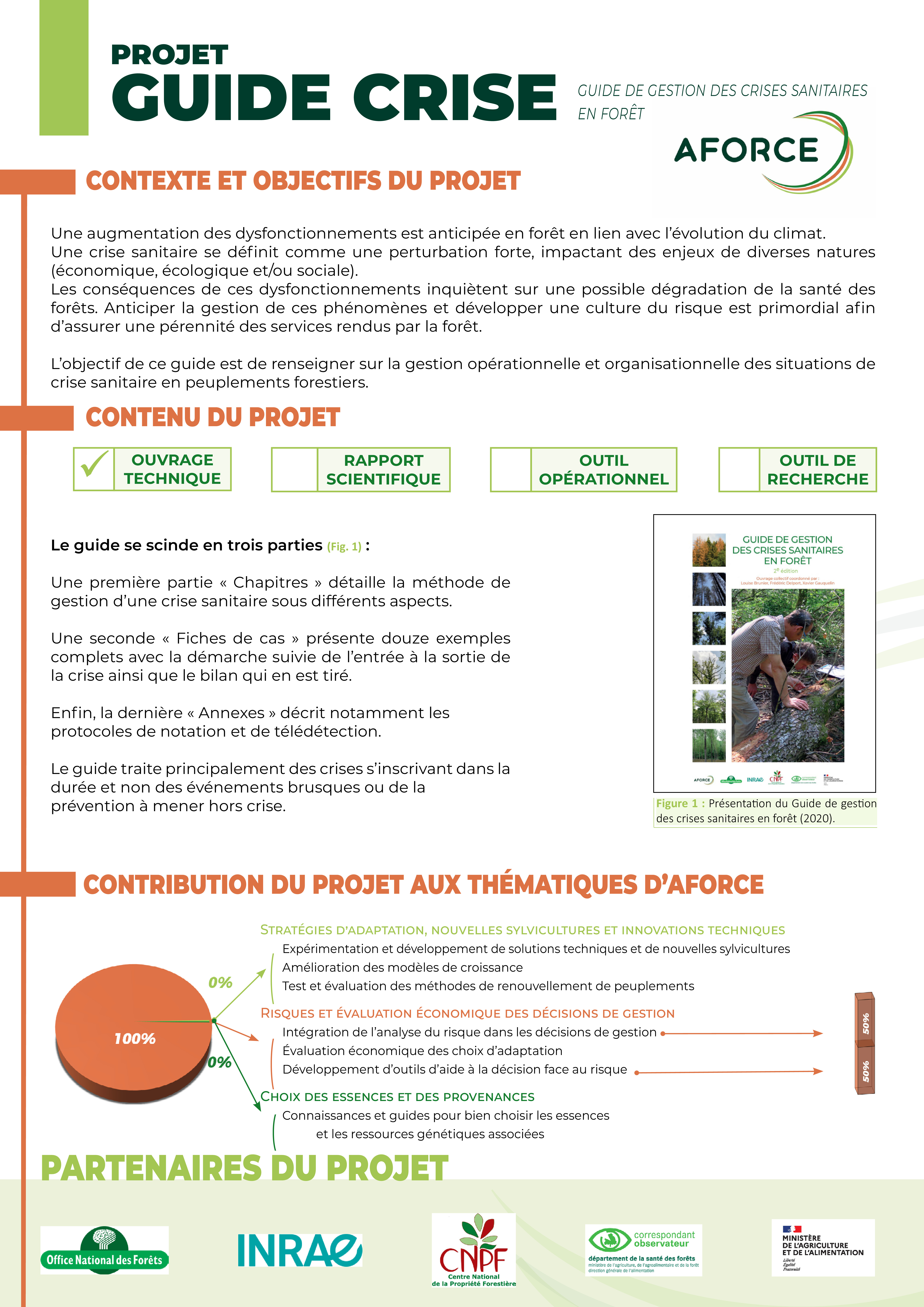 L'objectif du projet GUIDE CRISE était d'identifier et de mettre à disposition des acteurs forestiers (agents de terrain, techniciens, animateurs techniques, gestionnaires...), un guide regroupant les bonnes pratiques à mettre en œuvre pour gérer les différents événements liés à une crise sanitaire se déroulant dans la durée (2-8 ans).