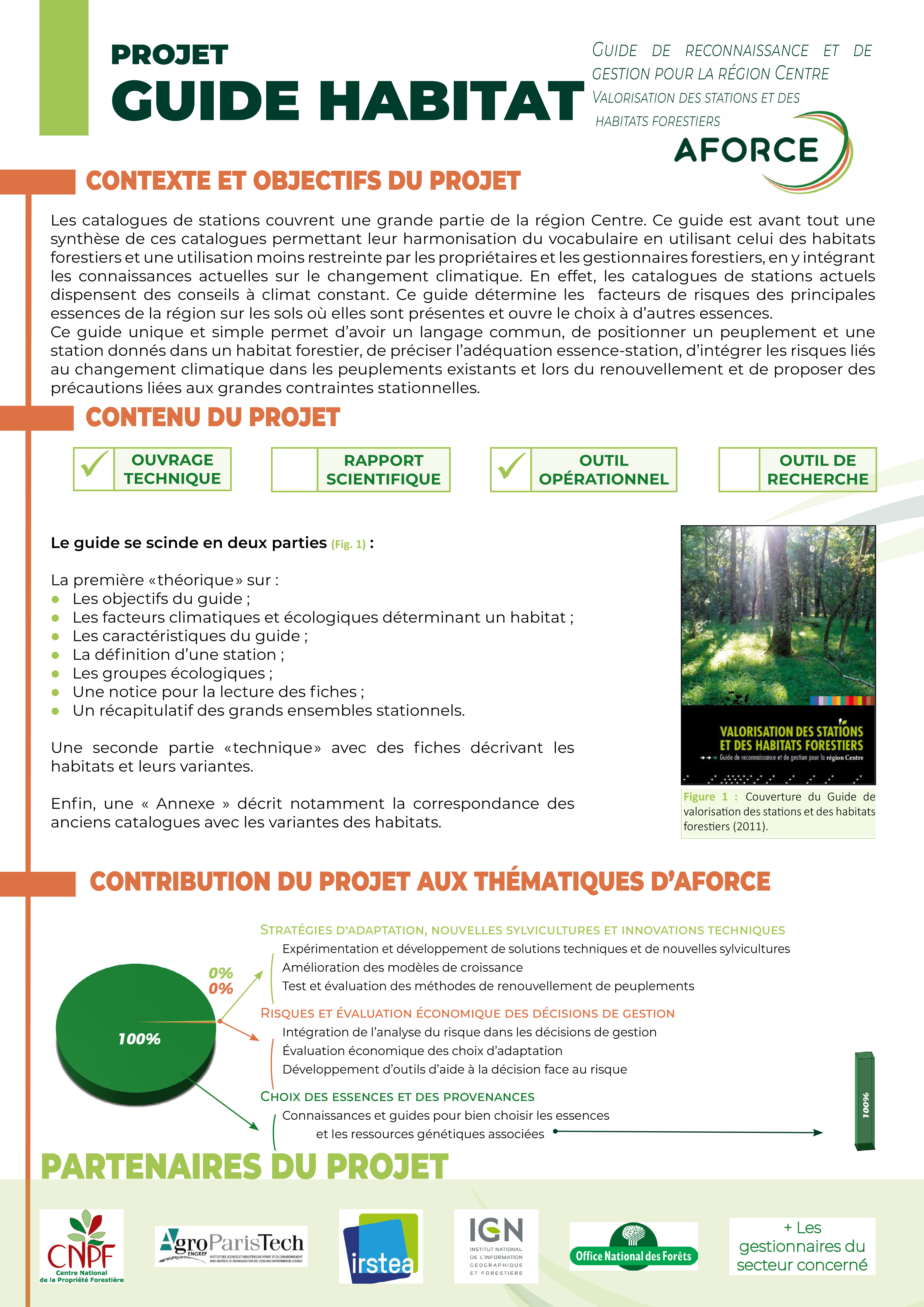 La région Centre dispose de nombreux catalogues de station de qualité, mais les conseils sylvicoles et de choix des essences y sont limités. Par ailleurs, ils n'intègrent pas la notion d'évolution du climat. Il a été décidé de faire une synthèse de ces catalogues de station et de l'adéquation essence-station, en y intégrant l'aspect changement climatique. Le projet GUIDE HABITATS a débouché sur un guide simplifié qui donne des directives de gestion à court terme en lien avec le changement climatique répondant en cela aux attentes des propriétaires et des gestionnaires, et en minimisant la prise de risque.