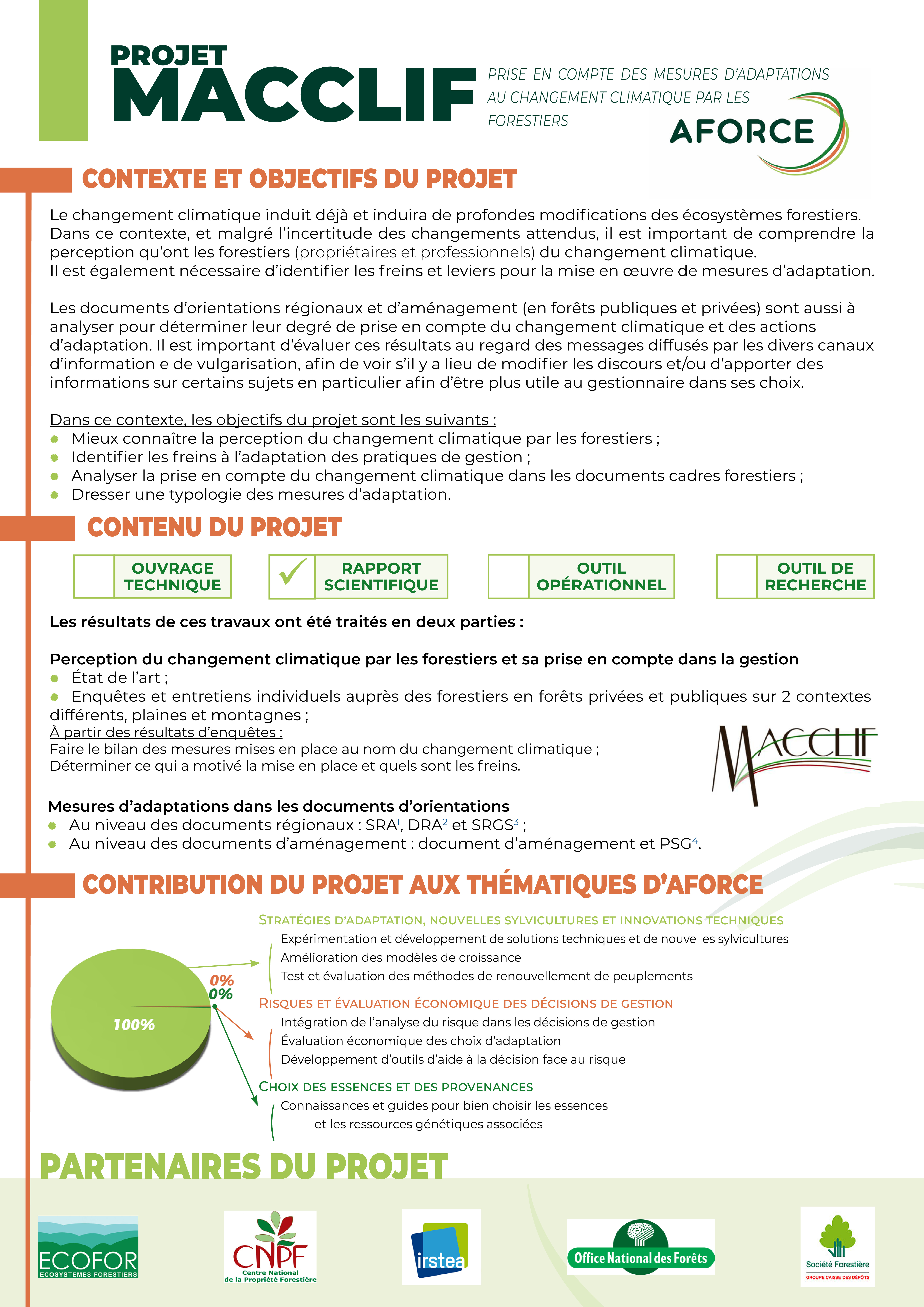 Le projet MACCLIF cherche tout d'abord à approfondir l’appréciation de la perception du changement climatique par les gestionnaires forestiers, via une enquête auprès des gestionnaires des forêts privées (RESOFOP) et de la forêt publique. Il vise de plus à faire le bilan des mesures d’adaptation citées dans les documents d’orientation régionaux et d’aménagement avec une analyse approfondie du vocabulaire ayant trait au changement climatique permettant de mettre en lumière la prise en compte du changement climatique dans ces documents. Enfin il souhaite proposer un diagnostic, fondé notamment sur une typologie des mesures d’adaptation, et tirer des enseignements sur les messages à adresser aux gestionnaires forestiers.