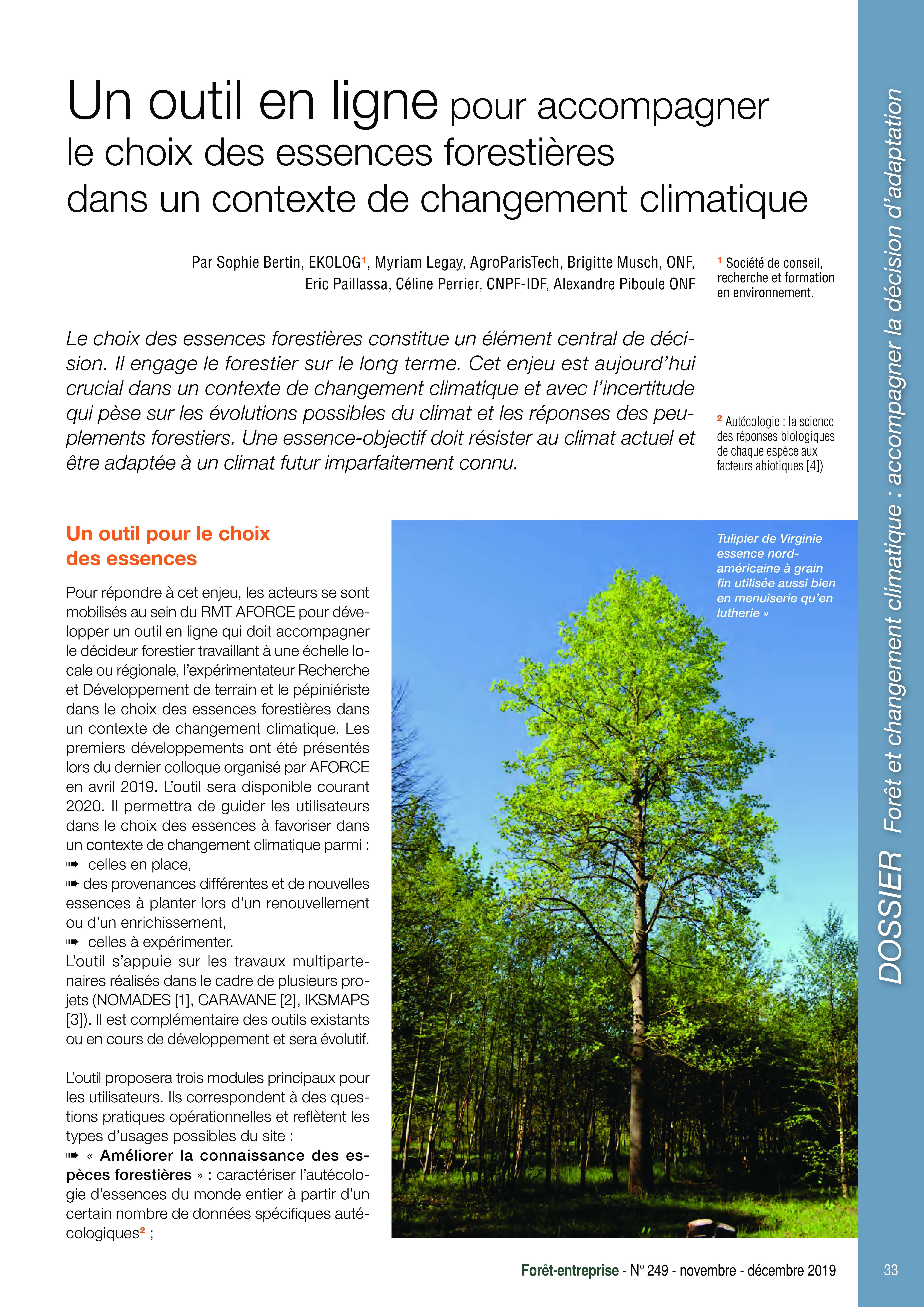 BERTIN S., LEGAY M., MUSCH B., PAILLASSA E., PERRIER C. & PIBOULE A., 2019. Un outil en ligne pour accompagner le choix des essences forestières dans un contexte de changement climatique. Forêt Entreprise n°249 in Dossier “Forêt et changement climatique : accompagner la décision d'adaptation”. pp 33-34.