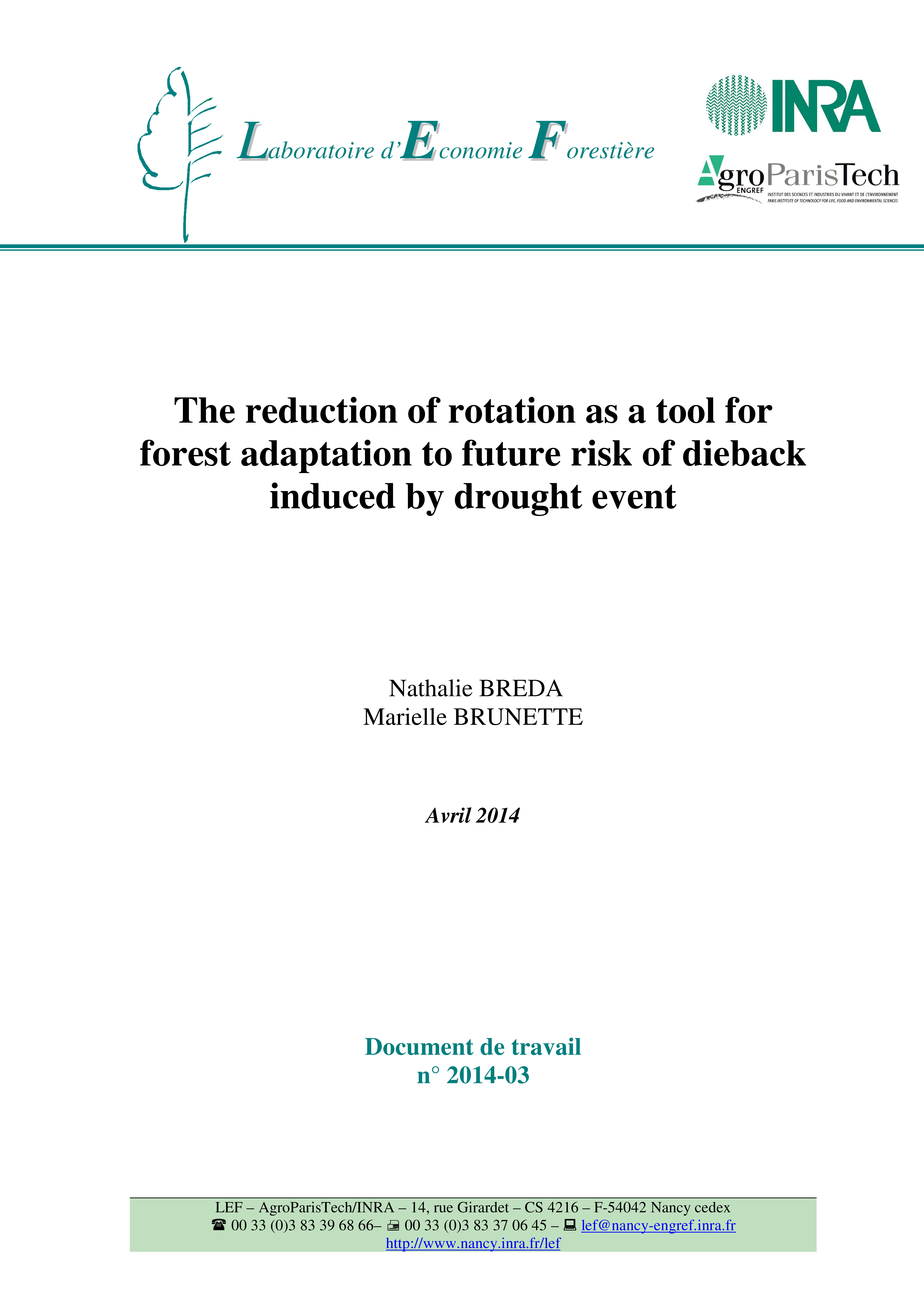 BREDA N. & BRUNETTE M., 2014. The reduction of rotation as a tool for forest adaptation to future risk of dieback induced by drought event. Document de travail du LEF n°2014-03. 27 pages.
