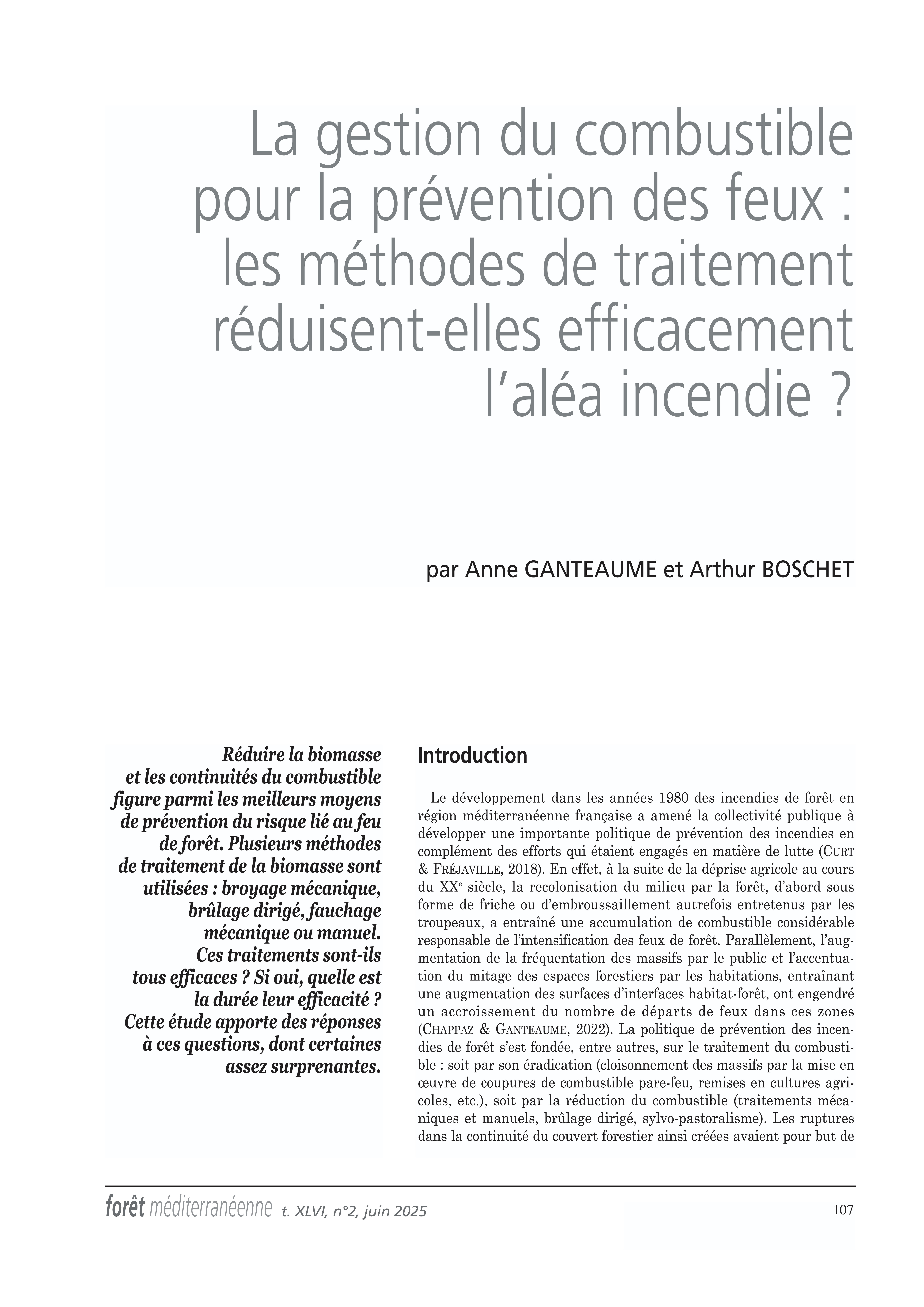 GANTEAUME A., BOSCHET A., 2025. La gestion du combustible pour la prévention des feux : les méthodes de traitement réduisent-elles efficacement l'aléa incendie ? Forêt méditerranéenne. Tome XLVI, n°2, juin 2025, pp. 107-118.