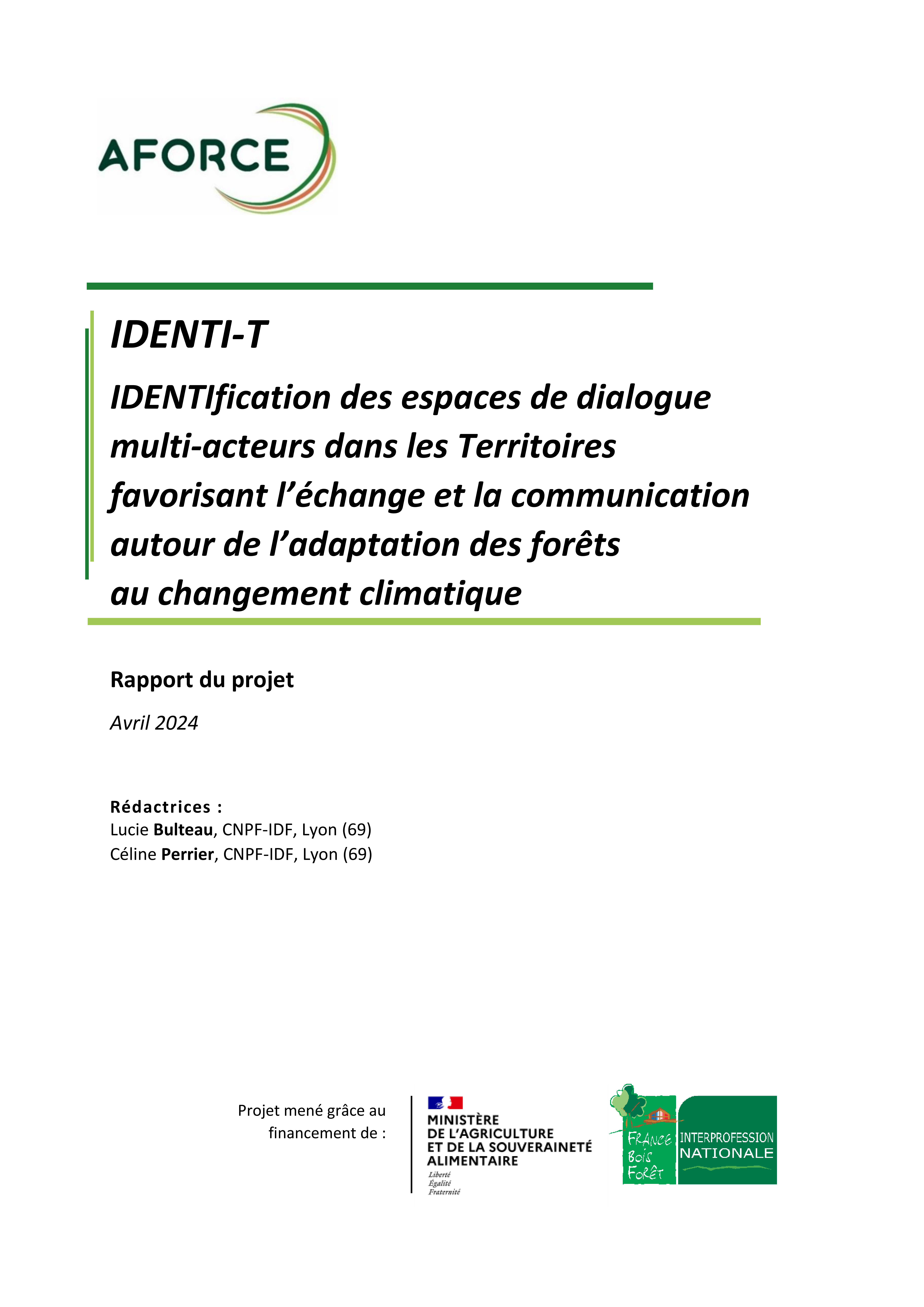 PERRIER C., BULTEAU L., 2024. Projet IDENTI-T - IDENTIfication des espaces de dialogue multi-acteurs dans les Territoires favorisant l'échange et la communication autour de l'adaptation des forêts au changement climatique. Rapport final. 15 pages.