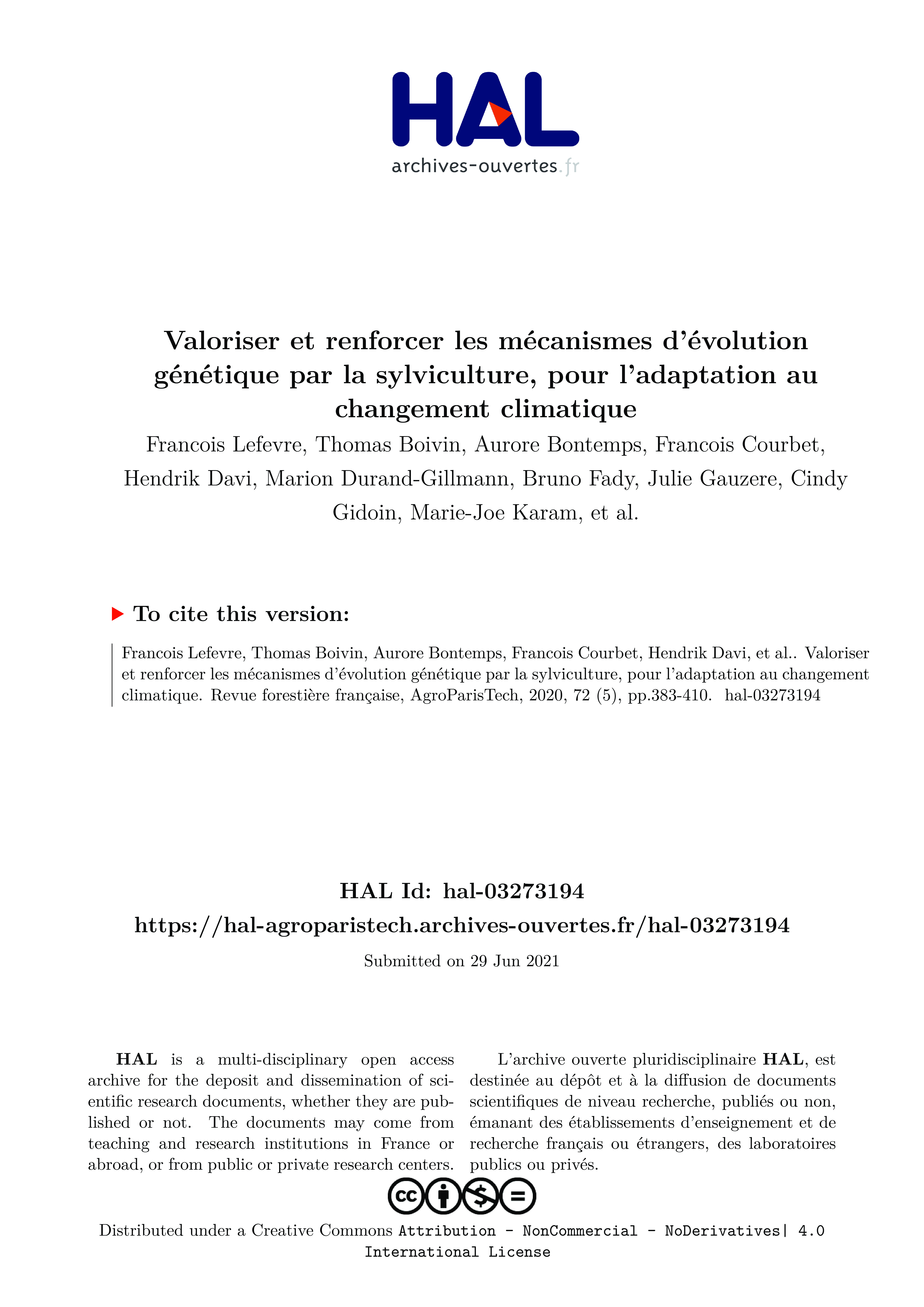 LEFEVRE F., BOIVIN T., BONTEMPS A., COURBET F., DAVI H. & al., 2020. Valoriser et renforcer les mécanismes d’évolution génétique par la sylviculture, pour l’adaptation au changement climatique. Revue forestière française n°72. Pages 383-410.