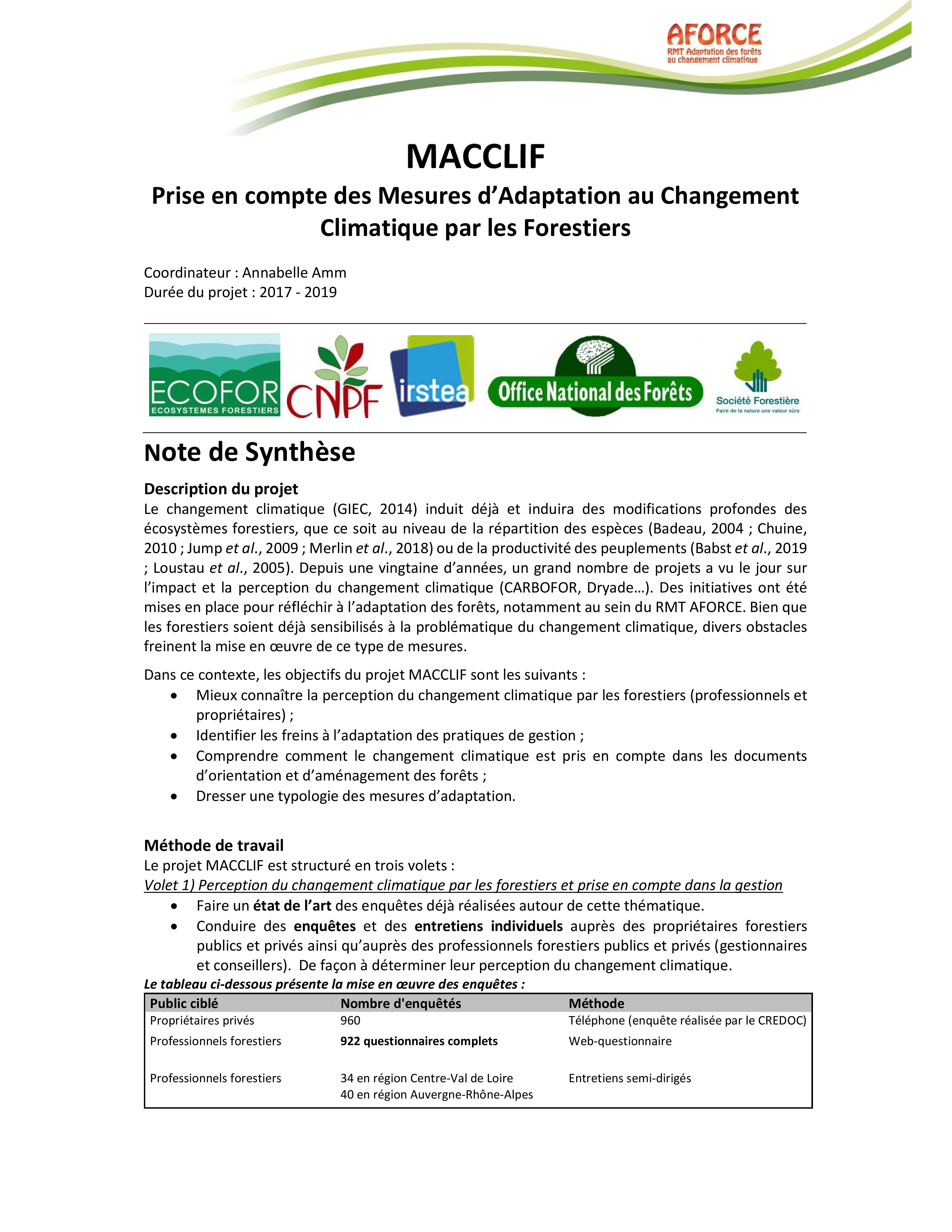AMM A., 2019. Projet MACCLIF - Prise en compte des Mesures d’Adaptation au Changement CLImatique par les gestionnaires Forestiers. Note de synthèse. 5 pages.