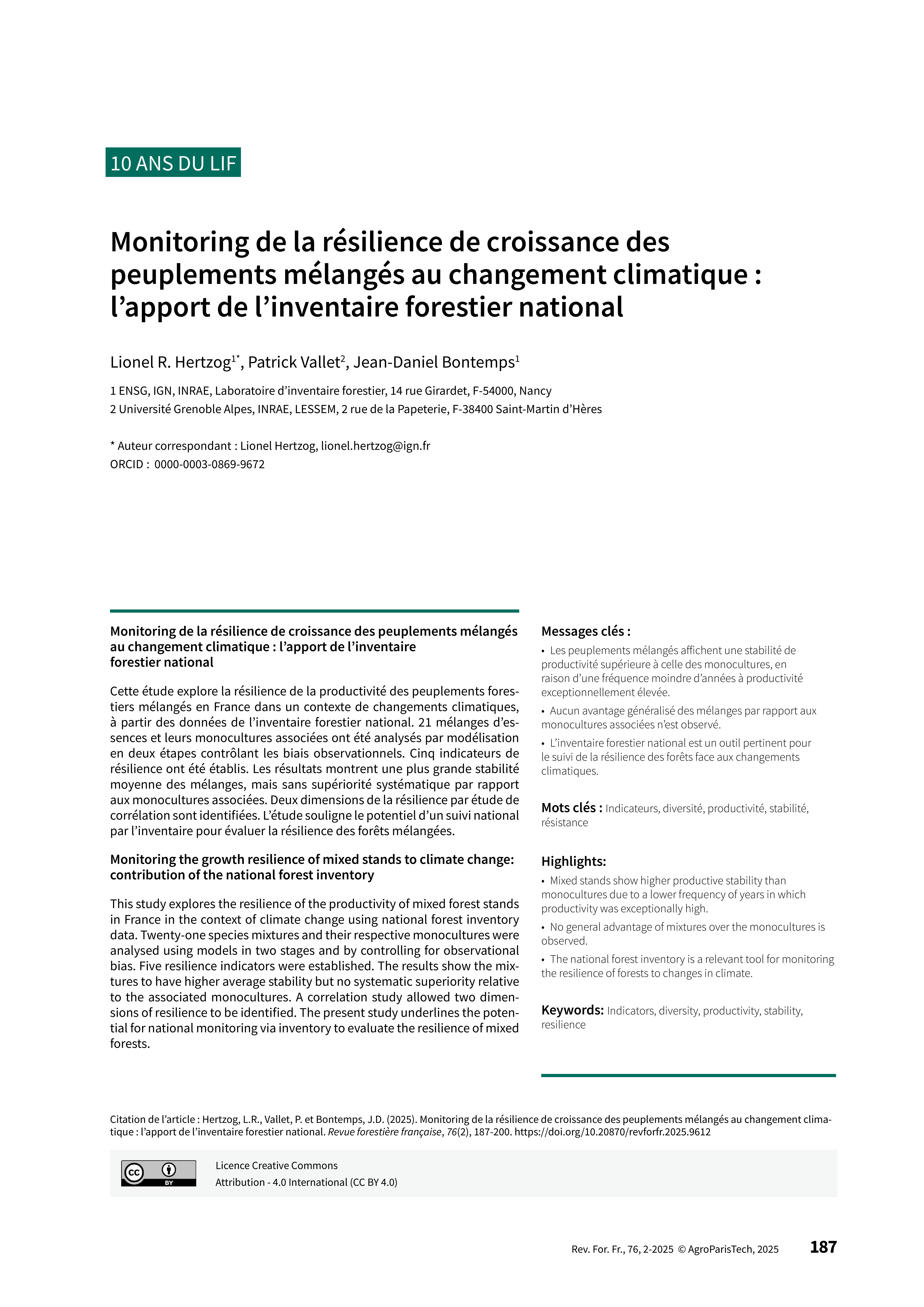 Hertzog, L. R., Vallet, P., & Bontemps, J.-D. (2025). Monitoring de la résilience des peuplements mélangés au changement climatique : l’apport de l’inventaire forestier national. Revue forestière française, 76(2), 187–200. https://doi.org/10.20870/revforfr.2025.9612
