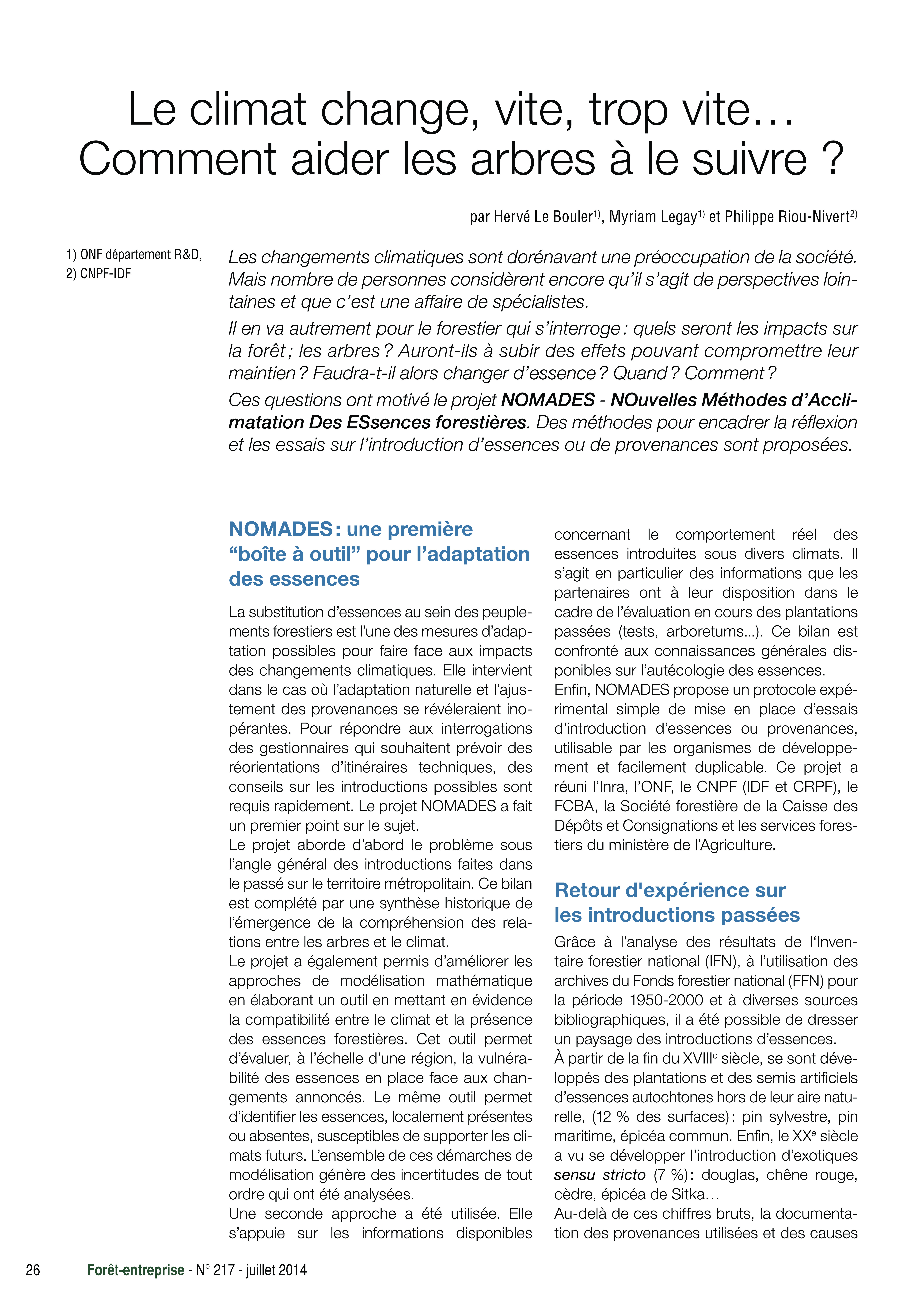 LE BOULER H., LEGAY M. & RIOU-NIVERT Ph., 2014. Forêt Entreprise n°217 in Dossier “Changement climatique : de nouveaux outils pour guider l'adaptation”. Pages 26-29.