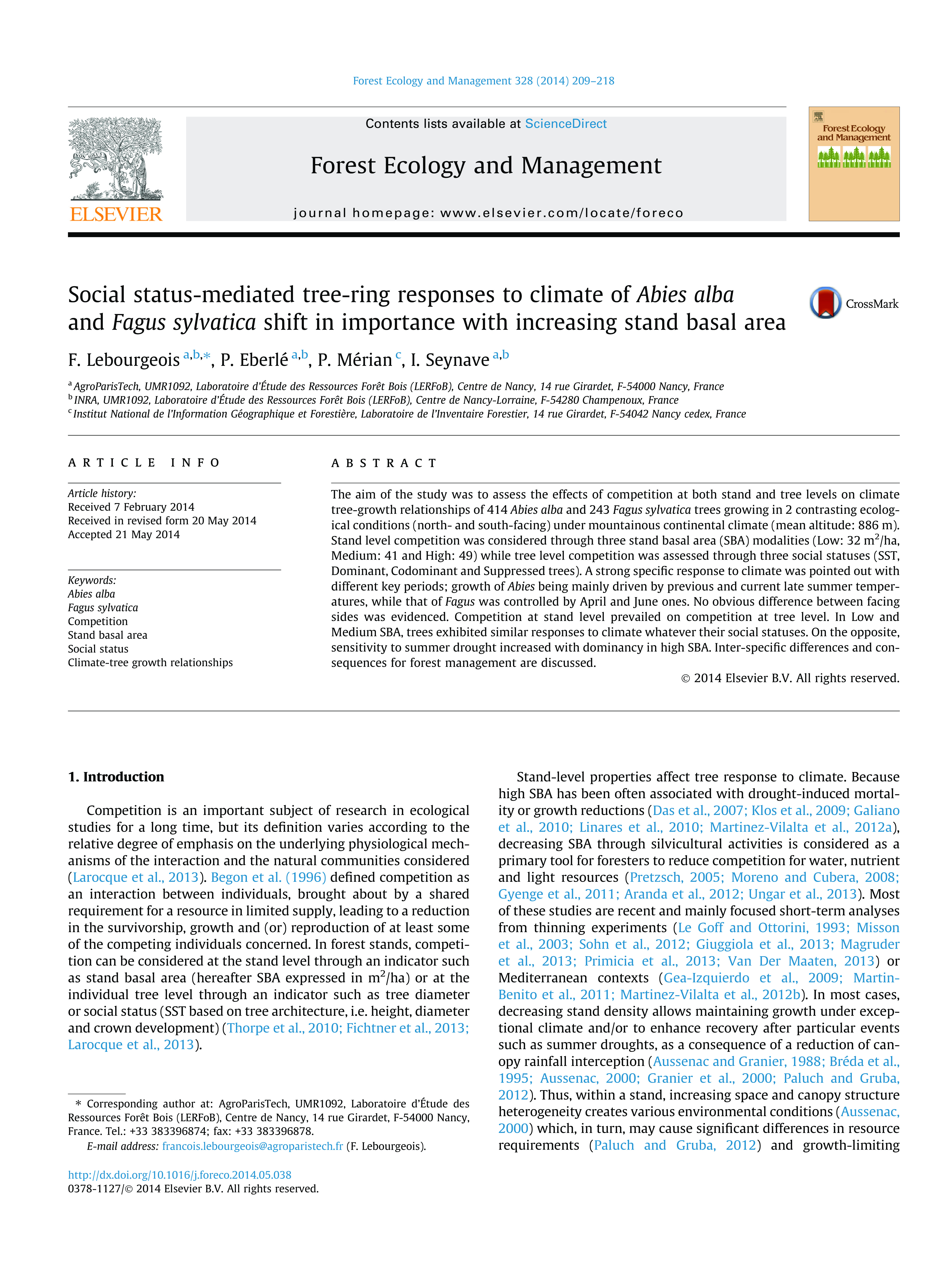 LEBOURGEOIS F., EBERLE P., MERIAN P. & SEYNAVE I., 2014. Social status-mediated tree-ring responses to climate of Abies alba and Fagus sylvatica shift in importance with increasing stand basal area. Forest Ecology and Management 328 (2014). pp 209–218.