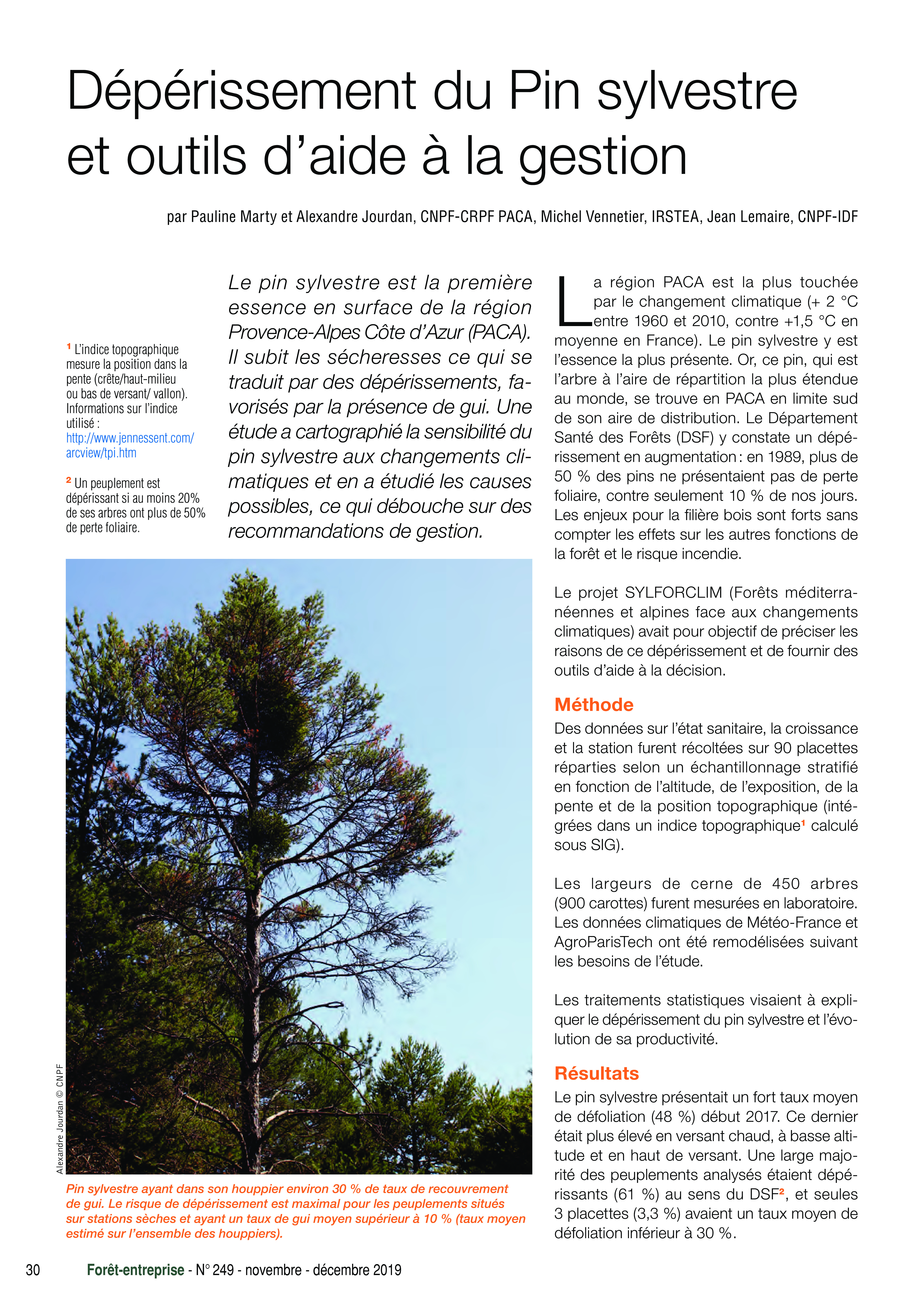 Projet SYLFORCLIM - Dépérissement du Pin sylvestre et outils d’aide à la gestion. Forêt Entreprise n° 249